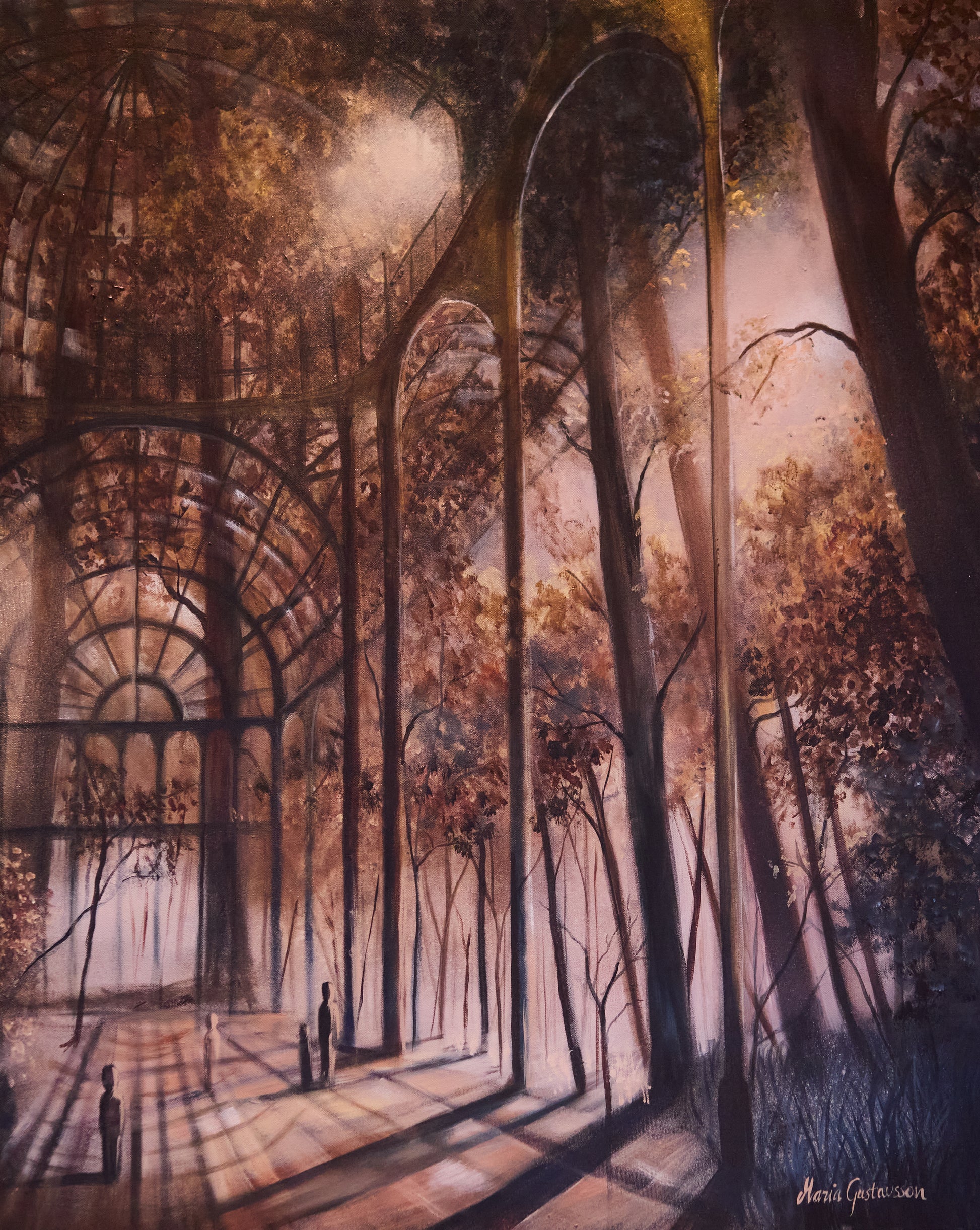 Det är en drömsk plats – kanske verklig, kanske inre – men fylld av närvaro. Ljuset rör sig försiktigt mellan blad och bågar, och människorna där inne ser nästan ut att vandra i ett gammalt minne.